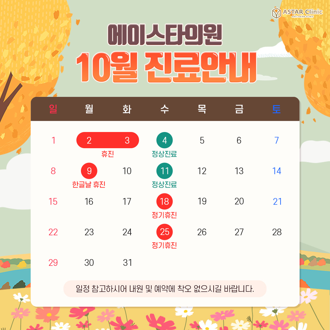 아래와 같이 2023년 10월 진료 일정 안내드립니다.