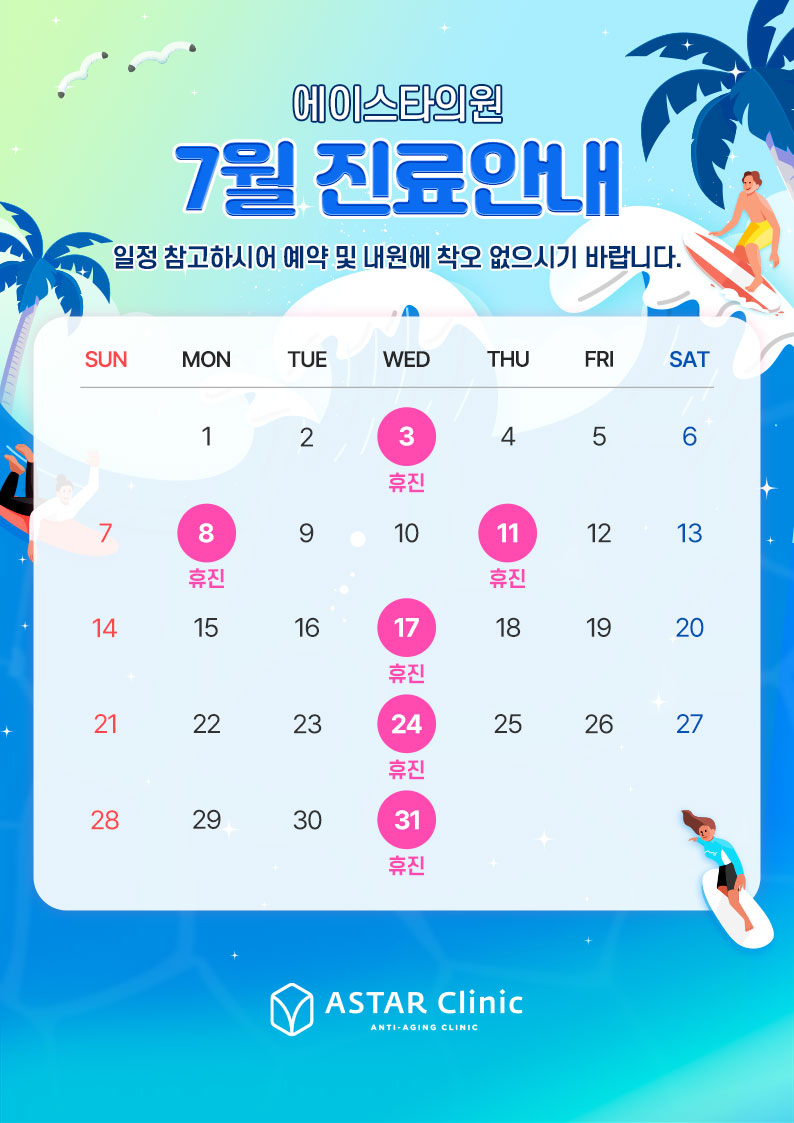 아래와 같이 2024년 7월 진료 일정 안내드립니다.