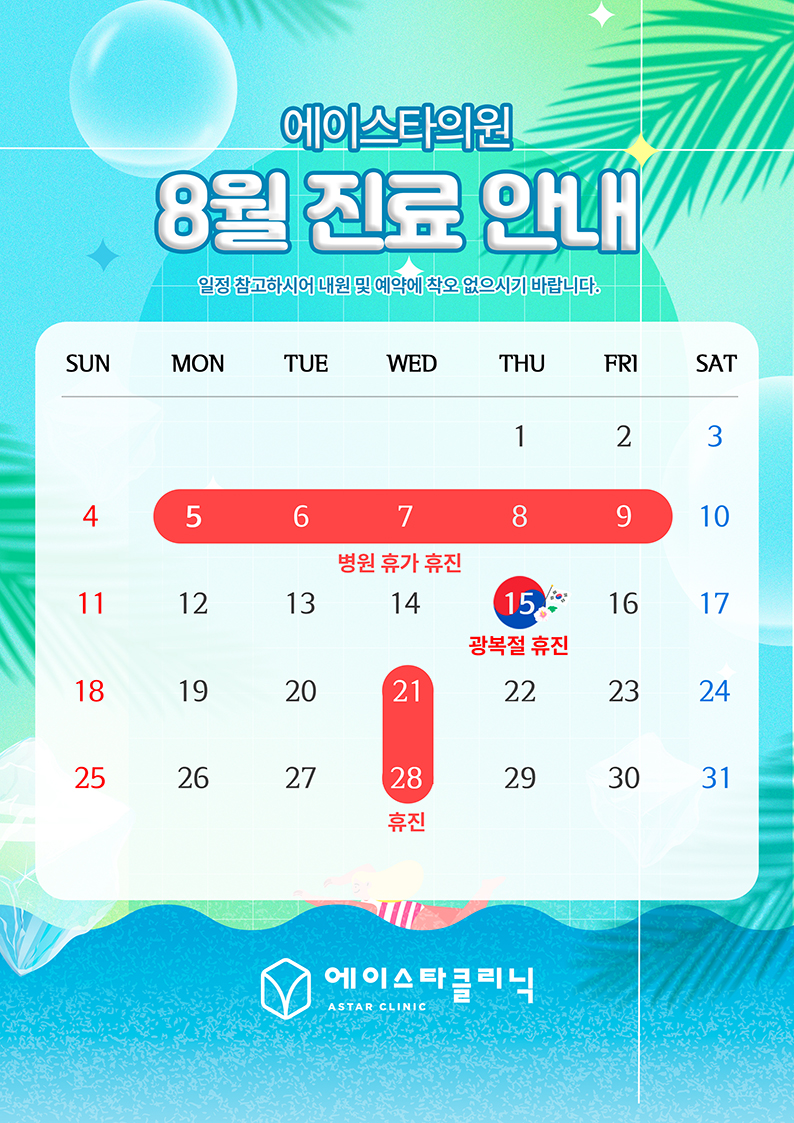 아래와 같이 2024년 8월 진료 일정 안내드립니다.
